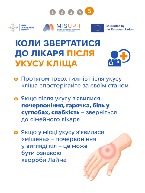 Хвороба Лайма може починатися з почервоніння на місці укусу кліща, схоже на мішень (червоні кола), головного болю, млявості, болю в тілі. Якщо її не лікувати на ранній стадії — це може призвести до ураження шкіри, суглобів, серця, нервової системи й навіть до інвалідності.
