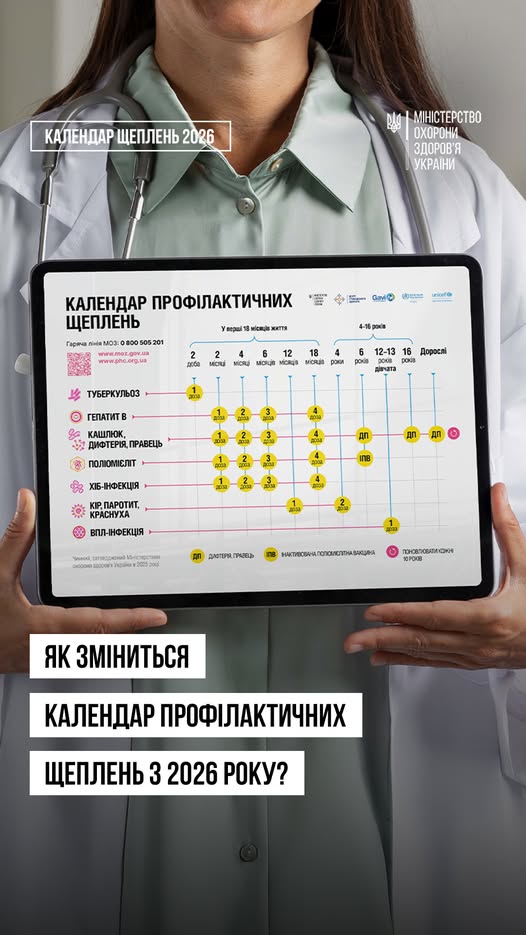 Оновлений Календар профілактичних щеплень з 1 січня 2026 року охоплюватиме обов’язкову вакцинацію проти 11 інфекційних захворювань: туберкульоз, гепатит В, кір, паротит, краснуха, поліомієліт, дифтерія, правець, кашлюк, ХІБ-інфекція та вірус папіломи людини (ВПЛ).
