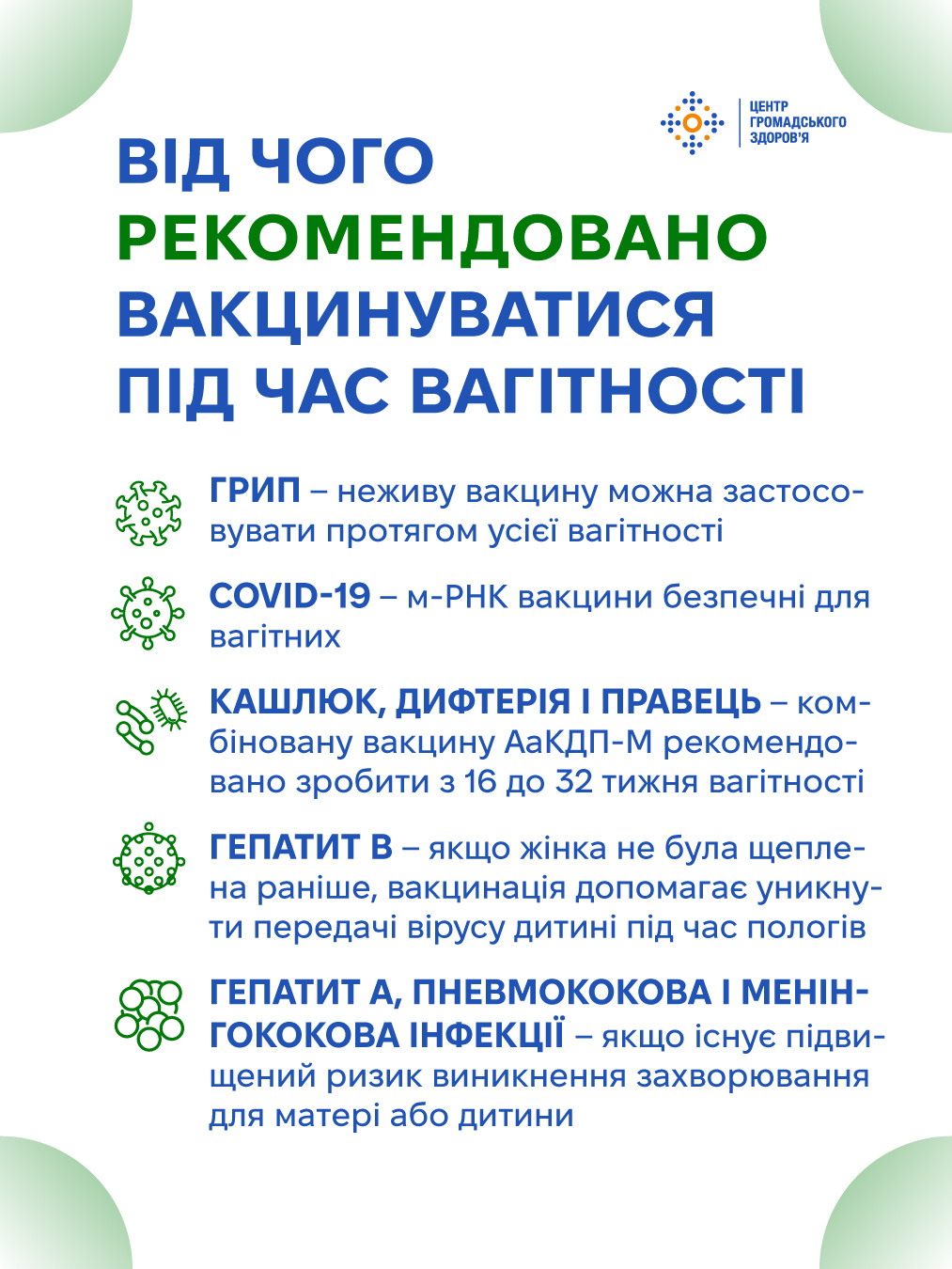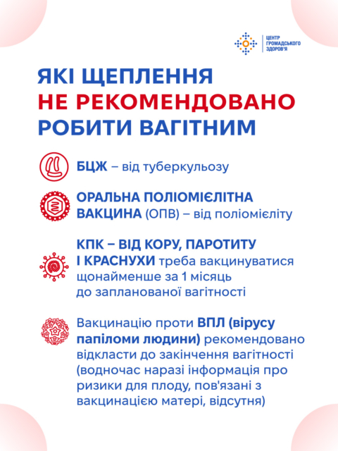 від кашлюку та COVID-19 рекомендують ревакцинуватися під час кожної вагітності;
