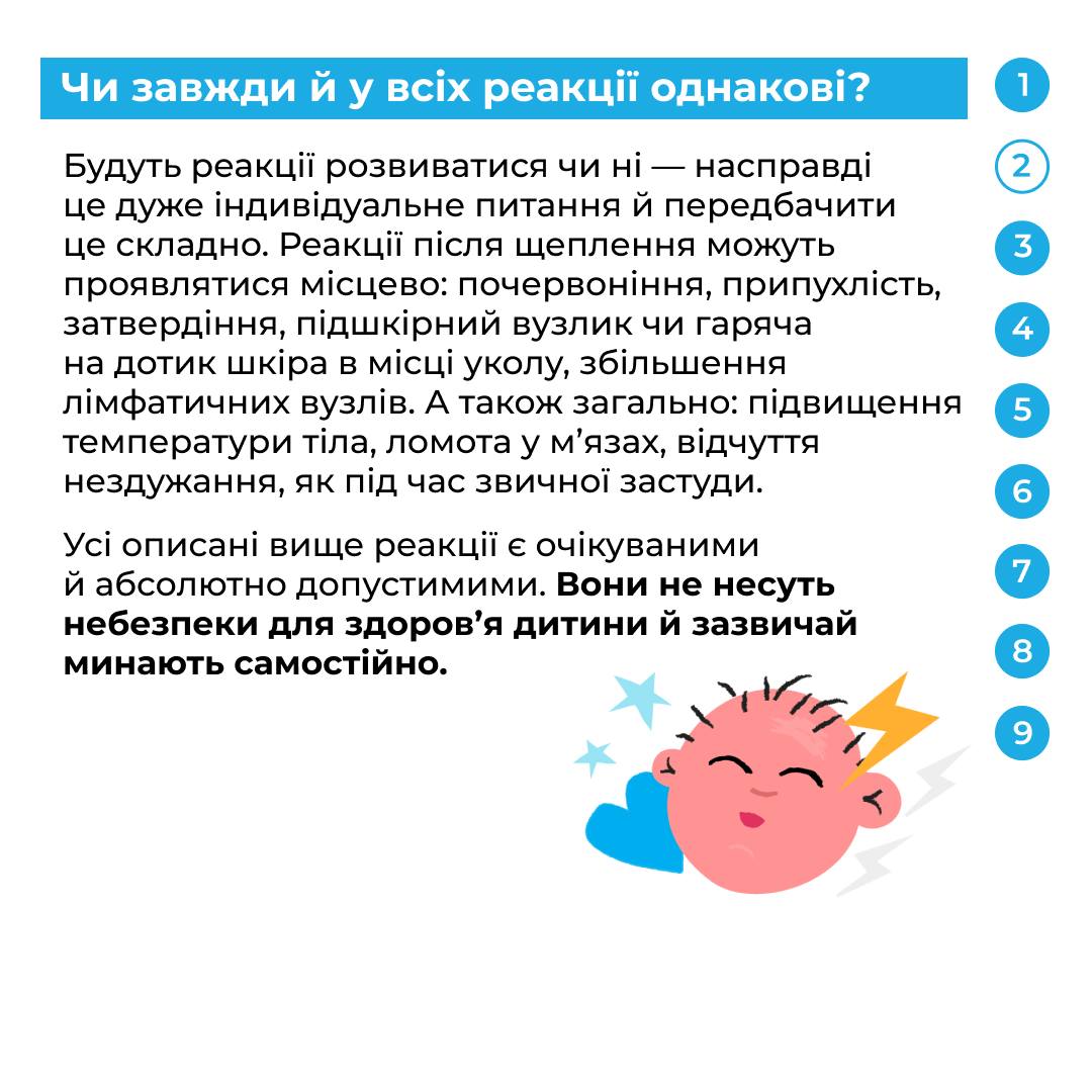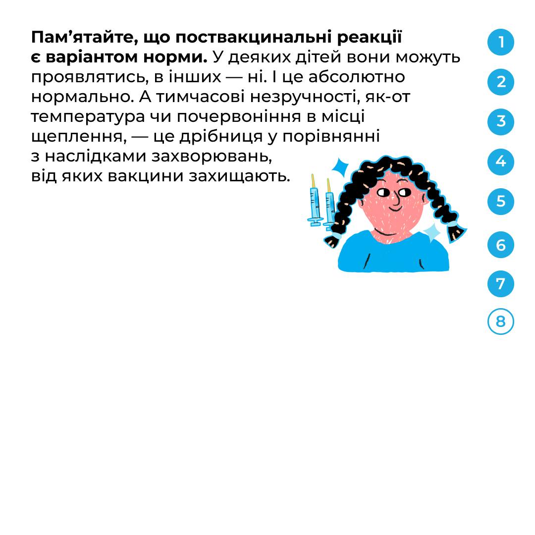 Спільно з педіатринею Тетяною Тульчак з’ясовуємо, якими бувають нормальні реакції та що ще варто знати про вакцини й самопочуття після щеплення. Гортайте картки