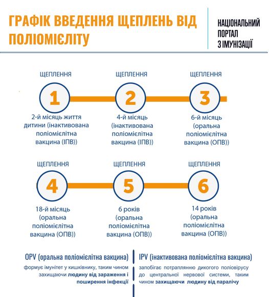 Для того, аби отримати захист від поліомієліту на все життя, достатньо отримати курс щеплень в дитинстві. Графік щеплень в Україні наступний: