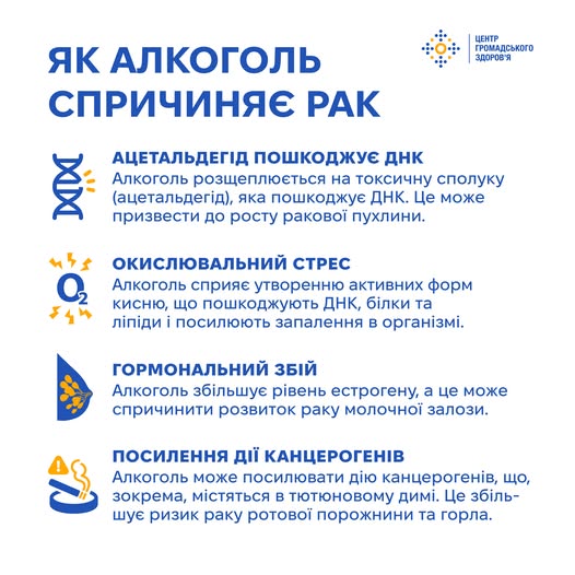 Центр громадського здоров’я України пояснює, як саме алкоголь спричиняє рак, які механізми лежать в основі цього процесу та чому навіть помірне споживання несе загрозу. Ми закликаємо кожного замислитися над своїми звичками та обрати здоров’я замість ризику.