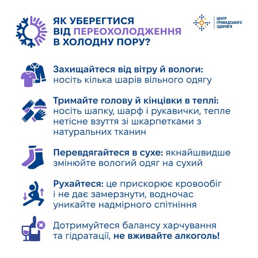 тримайте голову й кінцівки в теплі й сухості: носіть шапку, шарф і рукавички, тепле нетісне взуття зі шкарпетками з натуральних тканин;