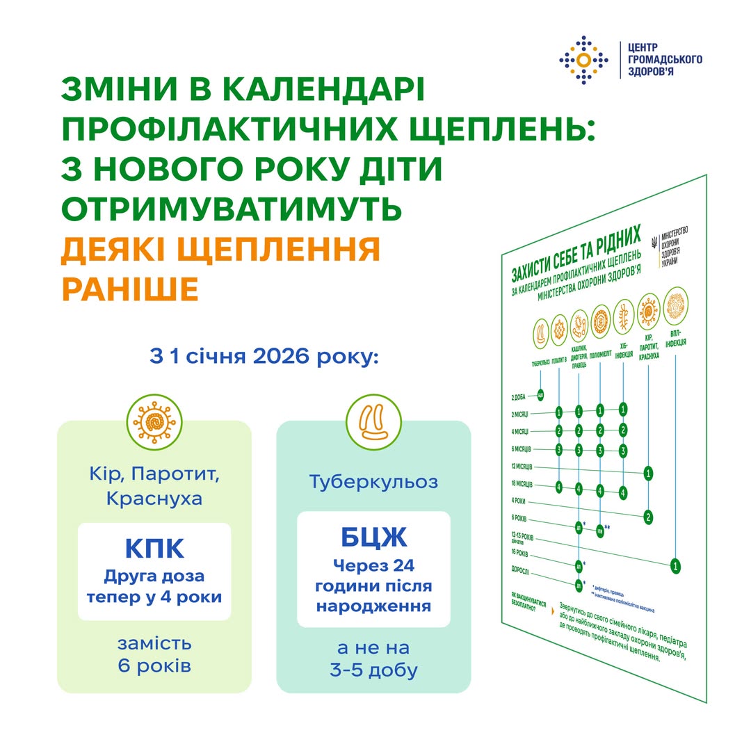 З 1 січня 2026 року в Україні починає діяти Календар профілактичних щеплень зі змінами, які відповідають сучасним міжнародним стандартам з імунізації та покликані, зокрема, раніше забезпечити дітям захист від таких інфекцій, як туберкульоз, кір, паротит і краснуха.